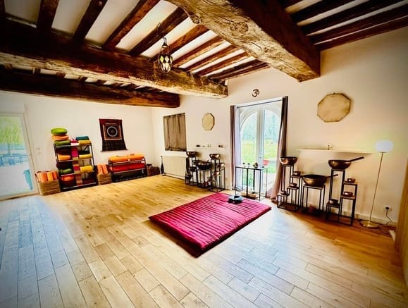 Une magnifique salle pour pratiquer avec vue sur la nature, un salon cocooning pour profiter des soirées ensemble, des chambres propres et confortables, accès au sauna, jaccuzzi et hammam… le rêve 🧚♀️